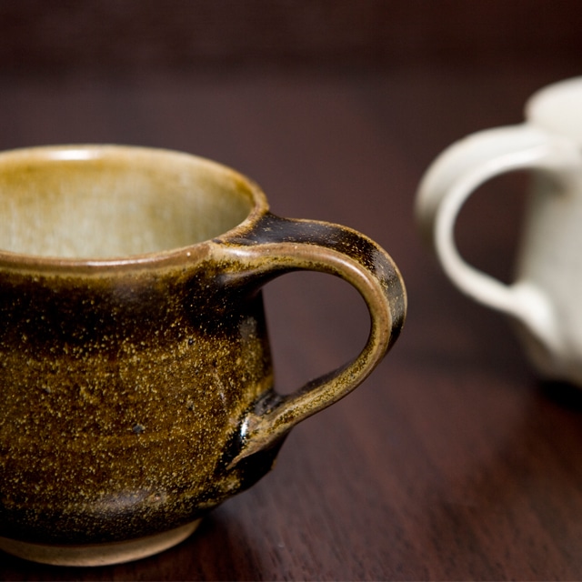 今回、ご紹介する「コーヒーカップ」と「丸カップ」は、それぞれ「飴釉」と「灰釉」の釉薬を使った作品です。釉薬のかかり具合で一つ一つ表情が変わってきます。また、ポツンと小さなへこみや逆に小さな突起があるものもあります。これは、釉薬の粉ひきのような独特な質感によるものです。このような手作り、自然の現象から生まれた温かみのある個性を楽しんでいただければと思います。